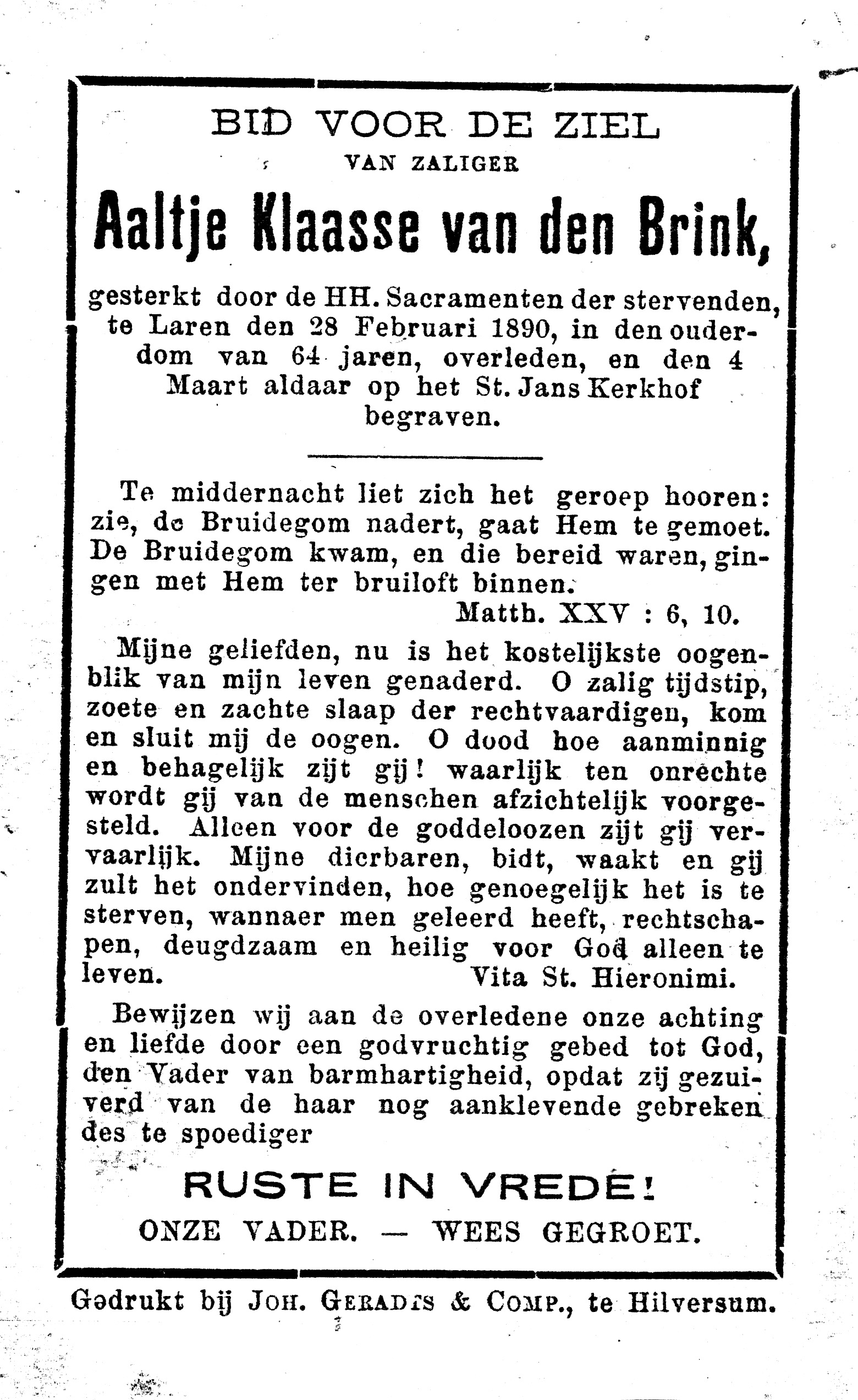 Bid voor de ziel van zaliger Aaltje Klaasse van den Brink